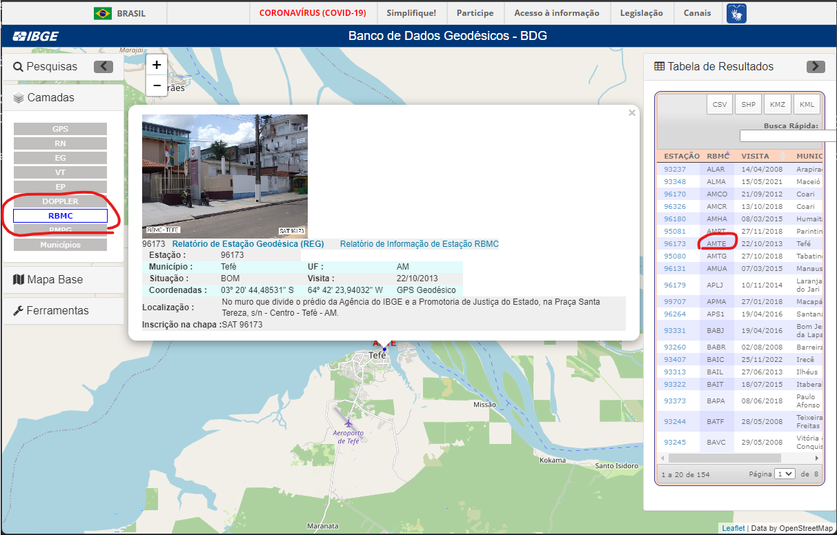 To download data, first identify the closest station to where the data was acquired. In this case, we will use as example the station located in Tefé, AM. In the interactive map, we make sure the RBMC layer is active, and then find the station by dragging and zooming the map. The stations will also be listed on the left (Figure 2.1)